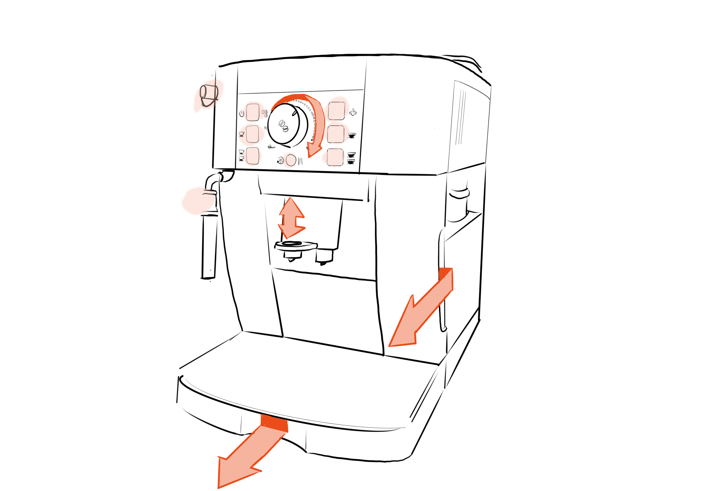I drew the interaction zones on the De’Longhi machine. Breaking down the movable parts to see how clear it is that the intended action is done. Are the signals clear enough?